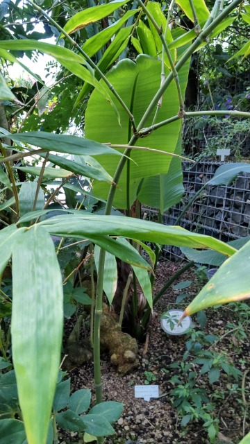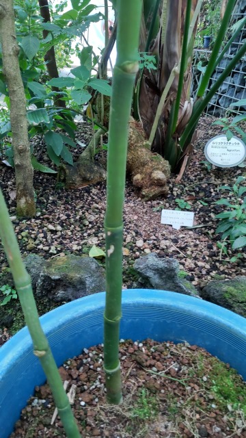 画像出典:いずれも新宿御苑にて筆者撮影 科名:イネ科マチク属 学名:Dendrocalamus latiflorus 原産地:中国、台湾 生態:多年生常緑竹 中国や台湾が原産の常緑の竹で、成長した株はわが国で栽培の多いモウソウチクをさらに大きくしたような見た目をしており、稈の高さは20m、直径は20cmに達する。節と節の間は20㎝~70㎝になり、節はやや膨らんでいるのが特徴である。葉は竹類の中でも大型で、枝も長く伸び、枝垂れ状となる。竹類の中では根茎が長くのびないので、新芽はすぐわきから出て株状になる。それゆえ、栽培の際にはそれほどの面積を必要としないのである。 本種のタケノコは食用になり、これを茹でて塩漬けにして発酵させ、天日で乾燥させたものが、ラーメンの上に乗っている「メンマ」である。これは「麺料理の上にのせる麻竹」ということで「麺麻」と呼ぶようになったのである。一昔前は「支那竹」と呼ばれていたのだが、「支那」の名称が差別的とされる現在ではこの名称は用いられなくなっている。