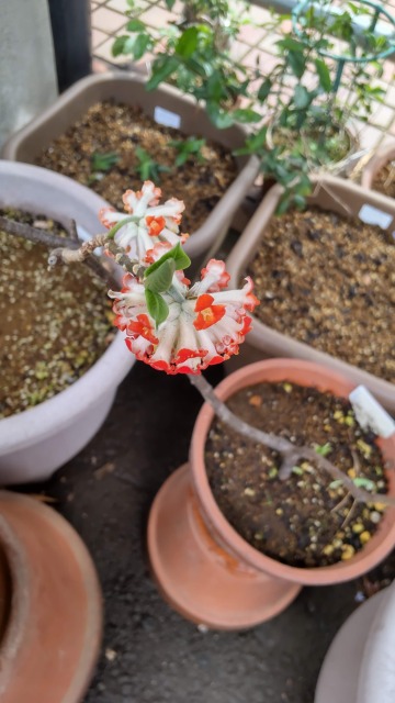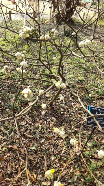 画像出典:(左)神代植物公園にて筆者撮影(右)東京都薬用植物園にて筆者撮影 科名:ジンチョウゲ科ミツマタ属 学名:Edgeworthia chrysantha 原産地:中国 生態:落葉低木 中国が原産の落葉低木で、我が国では古くから和紙の原料とするため栽培されてきた。現在は和紙の製造自体が少なくなってきたため、花を観賞用とするために庭に植えることが多い。とはいえ、本種を紙の材料にすることがまったくなくなったわけではなく、現在は1万円札紙幣の材料に用いられているようである。 樹高は成人の背丈ほどかそれより少し大きいくらいで、1mから2mとなる。三つ又状に出る枝により、丸い樹形が作られる。葉は全長8cm-15cmの広披針形で、裏面に絹状の毛がびっしりと生えている。 3月から4月にかけて葉を展開する前に、枝先に蜂の巣を思わせるような形状のつぼみをつけ、球状にびっしりと集まったような見た目の花を咲かせる。花の内側は黄色くなり、外側は毛におおわれている。園芸品種の中には花がやや大ぶりとなり、内側が赤くなる品種もある(写真右)。