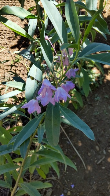 樹高は1mから2mで、葉は長さ10㎝から15㎝の長披針形で、先端は丸くなるかややとがり、茎に互生して粉を吹いたような灰色がかった青緑色である。