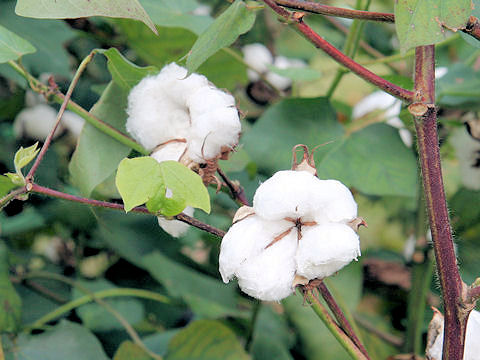 画像出典:https://www.botanic.jp/plants-wa/wata.htm 「ボタニックガーデン」より抜粋 科名:アオイ科ワタ属 学名:Gossypium arboreum var. indicum 原産地:インド 生態:1年草 インドや中南米が原産の一年草で、わが国には平安時代に渡来して以来、各地の種が渡来し、有用植物として栽培される。 原産地のインドや熱帯地域では多年草となるが、耐寒性がないので、わが国では一年草の扱いとなる。夏の盛りから秋にかけて、葉腋に柄のある淡い黄色の花を咲かせる。 花は薄地色の5枚の花弁がらせん状に重なり、基部は小豆色をしている。秋に蒴果をつけるが、熟すとはぜて綿毛を露出する。綿毛はいわゆる「コットンボール」で、詰め綿や脱脂綿、布団綿、ぬいぐるみなどに利用する。 また、種子からは油(綿実油)がとれ、主に食用に用いられる。