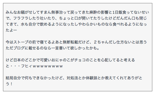 内容を読めば分かる通り、これは飼い主にとってもネコにとってもヤバい状況であったことが伺える。しかも、顎が外れたのが夜で、この時間は動物病院はやっていなかったため、ますますパニクってしまうのも無理はない。