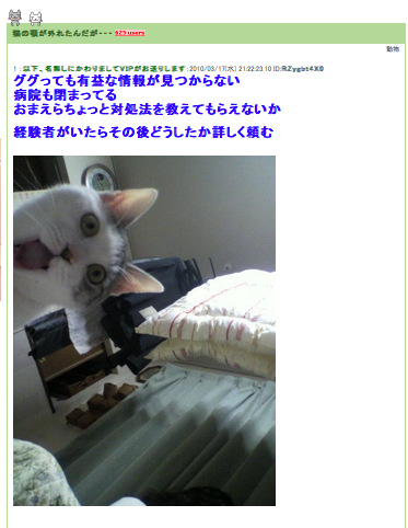 よく考えてみれば、2ちゃんねるでこんな画像を投稿したらどうなるのか予想がついたはずなのだろうが、よほど慌てていたのか、チョコレートの飼い主*1はわらにもすがる思いでこれを投稿したのだ。