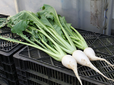 カブ(蕪、蕪靑)は、食用として栽培される作物の一種である。 画像出典:(左1)自宅にて筆者撮影。筆者弟が学校の菜園で収穫し持ち帰ったもの。(右1)東京都薬用植物園にて筆者撮影。トウ立ちした「小カブ」の系統。(左2)赤カブ。自宅近くの農産物直売所にて筆者撮影。(右2)日野菜カブ。根の長さは30㎝に達することも。東武百貨店池袋店にて筆者撮影。(左3)黄カブ。東武百貨店池袋店にて筆者撮影。(右3)聖護院カブ。東武百貨店池袋店にて筆者撮影。葉に栄養分がすべて持っていかれるため、流通に乗る際は葉を切り落とす 近似種
