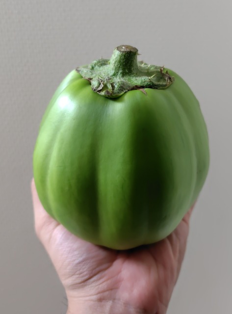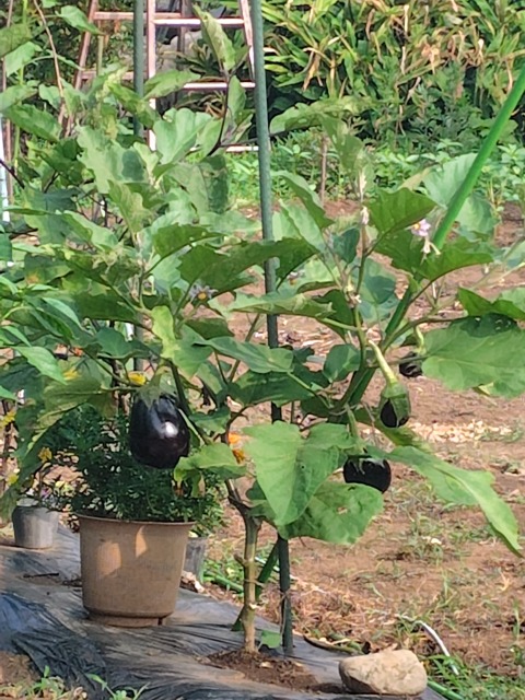 画像出典:(上)夢の島熱帯植物館にて撮影。「セイヨウマルナス」と呼ばれる系統の品種で、トキタ種苗が開発した「カレーにインド」という品種である。(中)同じく「セイヨウマルナス」と呼ばれる品種で、アメリカ原産の「ブラック・ビューティー」を原種とする「米茄子」の系統。自宅近くの畑にて筆者撮影。(下)筆者が池袋の百貨店にて撮影。「加茂ナス」。 果実が完全な球体の品種。わが国に伝来して以降、当初はこちらの品種が栽培の主流で、現在のような長ナスは時代がだいぶ下ってから作出されたようである。新潟県の長岡巾着や京都の大芹川(賀茂)が有名である。煮物や漬物に向くが、特に田楽にされることが多い。セイヨウマルナスあるいは「米ナス」と呼ばれる品種は、蔕が緑色である。チーズ焼きやカレーなどに向く。