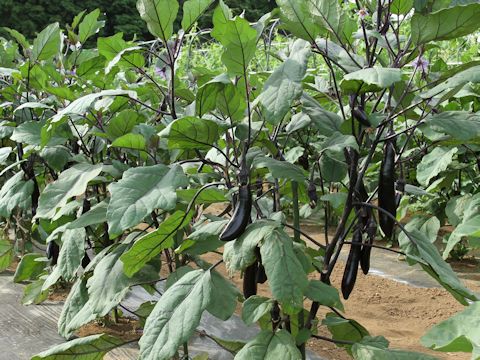 画像出典:https://botanic.jp/plants-na/nasu.htm 「ボタニック・ガーデン」の「なす」のページから。 画像出典:所沢市の商業施設にて筆者撮影 果実が細長くなる品種。現在市場で売られているナスは「長卵形ナス」という品種で、千両なすの系統が多く栽培される。ここで取り上げるナガナスは20cm近くの長さに達することがあるほど、細長い品種である。福岡県の博多長なすがこの代表である。焼く、煮付ける、汁の実にする、漬け物など調理の範囲が広い。 東南アジアでは果皮にナスニンという紫色の色素が含まれずに、一見すると細長い黄緑色のウリのような見た目をした長ナスが栽培されている。わが国でもこうした系統の長ナスがみられるようになった。