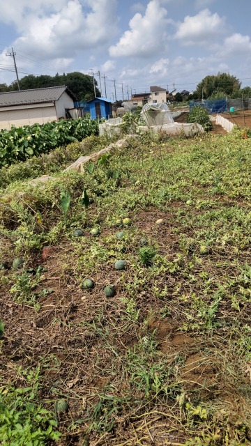 画像出典:(左)スイカの花と蔓。自宅近くの園芸店にて筆者撮影。(右)自宅近くの畑にて撮影。