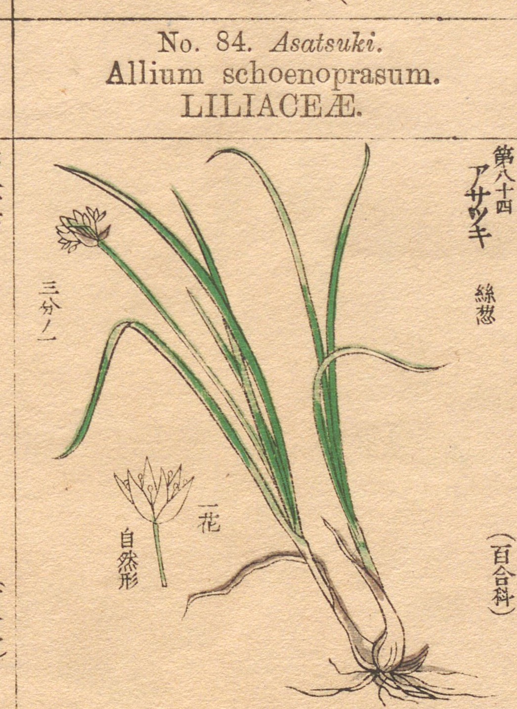 アサツキは、香味野菜の一種である。 画像出典:https://iiif.dl.itc.u-tokyo.ac.jp/repo/s/agriculture/document/5bfde8bf-0b54-7848-97d6-1ee30cf9a645#?c=0&m=0&s=0&cv=13&xywh=2984%2C1893%2C2758%2C2128 「有用植物図説」より抜粋 科名:ヒガンバナ科ネギ属 学名:Allium schoenoprasum var. foliosum 原産地:北海道、本州、四国 生態:多年草 ヒガンバナ科の多年草で、わが国には奈良時代の書物「延喜式」に「阿佐豆木(あさつき)」の名称が登場する例が最古であるとされる。 全体的な特徴はワケギに似るが、ワケギに比べて葉は細く、しばしば分けつする。根にはラッキョウより小さな鱗茎がある。5月から6月にかけて半球形の薄紫色の花を咲かせる。 夏季には地上部は枯れるが、秋に再び葉を出し、冬まで青々とした葉が残る。 若葉を薬味とすることが多い。東北地方では、早春に軟白栽培したものが出回り、酢味噌和えなどで賞味される。関東では苗が若いうちに収穫した葉ネギが「あさつき」の名称で出回ることがある。