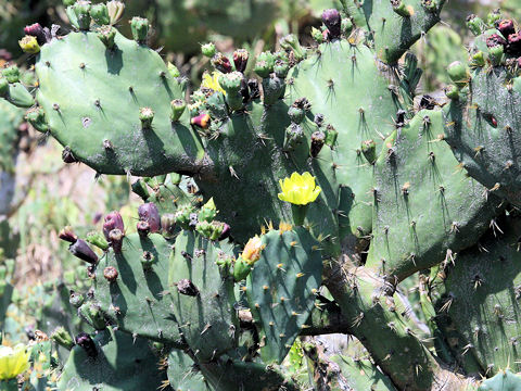 ウチワサボテンは、園芸植物の一種である。 画像出典:https://botanic.jp/plants-aa/utisab.htm 科名:サボテン科ウチワサボテン属 学名:Opuntia ficus-indica 原産地:メキシコ 生態:多年草 メキシコが原産の多年草で、わが国には江戸時代に渡来し、現在は温室や露地で栽培される。茎は高さ2m内外で、多数分岐し、茎の節は最大で30㎝ほどになる。表面に1本から2本の棘があり、基部に接した長い毛がある。葉は小さな針状で、この棘は葉が変化したもので、過度な水分蒸発を防ぐための工夫なのである。 夏に黄色の花を咲かせ、直径は7㎝~10㎝である。果実は洋ナシ型で赤紫色に熟し、「カクタスペア」あるいは現地名の「トゥーナ(tuná)」の名称で呼ばれ、果物として食用にする。また、棘が少ないかあるいはほとんどない品種は茎の表面を軽く削ぎ、棘をとってから焼いて食す。 和名のサボテンは、古くは油汚れを用いるために葉を用いていたが、それがシャボン、いわゆる石鹸のようであったため、シャボンテイ→サンホテイ→サボテンと転訛した。