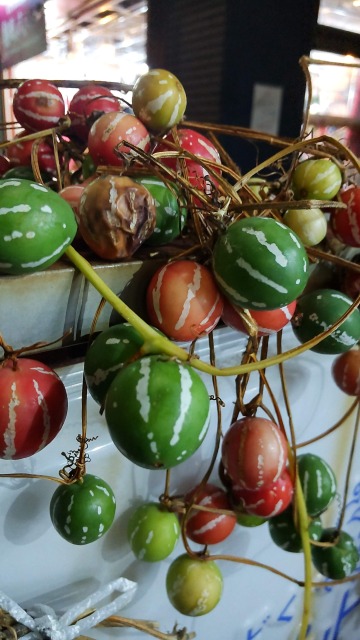 オキナワスズメウリとは、野草の一種である。 ||| 画像出典:(左)東京都薬用植物園にて筆者撮影/(右)自宅近くの花屋にて撮影 科名:ウリ科オキナワスズメウリ属 学名:Diplocyclos palmatus C. Jeffrey 原産地:インド 生態:蔓性一年草 一年生のつる性植物で、我が国では沖縄県の口之島や鹿児島県の吐噶喇列島などに野生するが、現在は各地で栽培されることが多い。我が国以外では中国南部やインド、オーストラリアに生息する。 葉は切れ込みの深い掌型で、雌雄同株。花は白色で、雄花と雌花は同一の葉腋から複数が束のように生じる。 白い縞模様のある、小さなスイカのような果実が特徴である。果実は当初緑色だが、赤熟する。 一見美味しそうに見えるが、渋みがあり、ククルビタシンという毒成分*1を含むので、食用にはできない。ただし、インドでは若い蔓を青菜として食用にする。 園芸店では「琉球オモチャ瓜」「スズメウリ・ビーチボール」の名称で流通し、グリーンカーテンの素材にする他、蔓を編んでクリスマス用のリースとする。 和名に「スズメウリ」とあるが、白い小さな球形の果実をつける野草のスズメウリ(スズメウリ属)とは別種である。