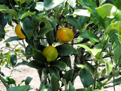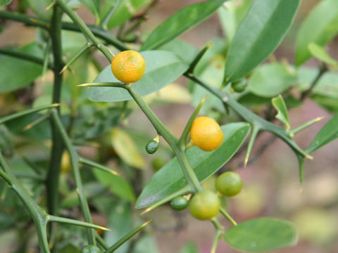 キンカンは、柑橘類の一種である。 画像出典:自宅近くの園芸店にて撮影 科名:ミカン科ミカン属(キンカン属に分類されることも) 学名:Citrus japonica(Fortunella japonica) 原産地:中国 生態:常緑低木 中国の長江流域が原産で、わが国には江戸時代初期に長崎を経由して渡来している。 樹高は2mほどで、しばしば枝分かれしする。能力色の葉は長さは5-7cmで互生し、先端のとがる長楕円形で厚く、周囲には浅い鋸歯がある。 夏から秋に白い5枚の花弁からなる花を咲かせ、晩秋から冬にかけて直径2㎝ほどの果実をつける。 果実は砂糖漬けや甘露煮、あるいは生食する。品種によっては酸味や渋みが強いので食用にはせず、観賞用にすることもある。、現在、市場に多く出回るのはマルミキンカンや寧波(ねいは)キンカンの系統である。