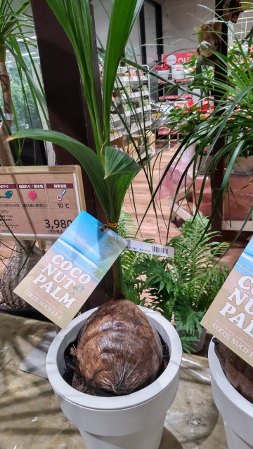 ココヤシとは、果樹の一種である。 画像出典:自宅近くの園芸店にて撮影 画像出典:https://commons.wikimedia.org/wiki/File:Cocos_nucifera_-_K%C3%B6hler%E2%80%93s_Medizinal-Pflanzen-187.jpg 科名:ヤシ科ココヤシ属 学名:Cocos nucifera L. 原産地:東南アジアやオセアニアなどの熱帯地域 生態:常緑高木 熱帯地域に生息する常緑高木で、単に「ヤシ」と呼称される場合はたいてい本種がイメージされている。海岸に生息し、樹高は20m~25mにまで成長する。葉は大きな羽状複葉で、長さは4mになり、幹の先端にまとまってつく。その部分には葉の付け根とそこから出る繊維が密集する。雌雄同株で大きな円錐花序を着け、先端に雄花を、根元の部分に雌花をつける。果実、いわゆるココナッツは緑色もしくは黄色で、やや先のとがる楕円形。その外側は丈夫な繊維を含む厚い層からなり、その内側に非常に固い殻に包まれた種子がある。こうした構造のため、果実は海水に浮き、しばしば本州や沖縄の海岸に漂着する。 果実の胚乳で未熟なものはココナッツジュースやココナッツミルクとして飲料にされ、熟したものはココナッツクリームとして、タイカレーなどの料理やサブレなどのお菓子の材料にされる。これを乾燥させたものは「コプラ」と呼ばれ、油やせっけん、マーガリンにする。 胚乳を乳酸発酵させて固めたものは「ナタ・デ・ココ」と呼ばれ、デザートとして食用にするほか、しなやかで折り曲げることができる薄型のディスプレイの開発の研究が進められている。 また、果実の繊維部分をたわしにするほか、葉を屋根を葺くのに用いたり、茎を材木として利用したり、葉の繊維で帽子や籠を編むのに用いられた。