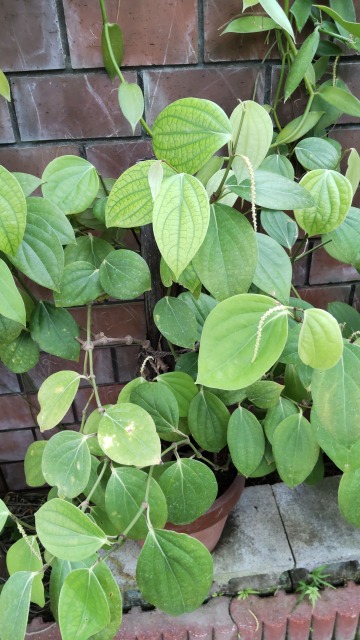 画像出典:(左)東京都薬用植物園にて筆者撮影/(右)https://commons.wikimedia.org/wiki/File:Piper_nigrum_2.jpg 科名;コショウ科コショウ属 学名:Piper nigrum 原産地:インド 生態:常緑蔓性木本 インド南西部のマラバル沿岸が原産で、東南アジアや南米でも栽培されるつる性の常緑木本植物である。わが国には奈良時代に中国から薬用植物として輸入され、平安時代には調味料としての利用が始まっている。 茎は蔓性で、長さは5m~9mに達し、しばしば他のものに絡みつく。 葉は卵形で互生する。穂状花序をだして淡黄白色の花を咲かせ、果実は液果で緑色から赤色に熟す。未熟果を乾燥させたものがブラックペッパー、未熟果を塩蔵したものがグリーンペッパー、完熟してから乾燥させたのちに水に漬けて外皮を柔らかくして剥がしたものがホワイトペッパー、完熟果を乾燥させたのち、その果皮をはがさないものがレッドペッパーである。 果実には柑橘類を思わせるような強い芳香と強烈な辛みがあり、香辛料の中でも多く用いられる。香辛料としては乾燥品が多く用いられるが、タイでは生のコショウが薬味として用いられる。