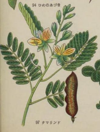 タマリンドとは、果物の一種である。 画像出典:村越三千男著『内外植物原色大図鑑』より抜粋。 科名:マメ科タマリンド属 学名:Tamarindus indica 原産地:熱帯アフリカ 生態:常緑高木 別名:チョウセンモダマ、羅望子(らぼうし) 熱帯アフリカが原産の常緑高木で、わが国では江戸後期の植物図鑑『本草図譜』(岩崎常正著)に収録された図版と解説がみられるのが最古である。現在は、大型スーパーや外国の食材を扱う専門店で販売される。 樹高は25mほどで、4月から5月に淡い黄色の花を咲かせ、花には赤い筋のような模様が入るのが特徴である。 果実はソラマメの莢を大きくしたような形状で、莢は分厚く、やや紫色がかった色合いである。果実の長さは7㎝から20㎝で、熟すと紙のように破れる。 果肉には梅干しにも似た酸味があり、果物として生殖するほか、カレーやピクルス、ジャムや舐めみその原料にする。ジュースの原料にもなる。 インドでの利用が盛んで、東南アジアや西アフリカでも料理に欠かせない食材である。さしずめ、わが国でいうところの大豆と同じ立ち位置である。 わが国では、意外なところに原料として利用されている。それは、桃屋の『ごはんですよ!』などの海苔の佃煮シリーズである。もともと、海苔の佃煮は固さがあり、子供やお年寄りにはやや食べにくい代物であった。 海苔の佃煮を老若男女誰でもが食べやすいペースト状にするのに、わが国にはなかなかふさわしい食材が見つからなかったが、ペースト状にする際、増粘剤として重要な役割を果たしたのが、本種の果肉である。
