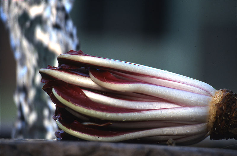 画像出典:(上)https://ja.wikipedia.org/wiki/%E3%83%A9%E3%83%87%E3%82%A3%E3%83%83%E3%82%AD%E3%82%AA 著作者:Kasteelhoeve Puth(Public domain)。(中1)「プレコーチェ」。東京都国分寺市にて筆者撮影。(中2)「タルディーボ」の画像。https://ja.wikipedia.org/wiki/%E3%83%81%E3%82%B3%E3%83%AA%E3%83%BC 著作者:Zetagroup(CC BY-SA 3.0) (下)「カステルフランコ」の画像。https://ja.wikipedia.org/wiki/%E3%83%81%E3%82%B3%E3%83%AA%E3%83%BC 著作者:Goldlocki(CC BY-SA 3.0) 植物学上はチコリと同一な品種の野菜である。わが国には1980年代に導入されていて、いまだ新顔野菜としての性格が強いといえる。紫キャベツに似た形状のもの(「キオッジャ」。このタイプがわが国でしばしば「トレビス」の和名で呼ばれるものである)と、写真のように白菜に似た形状(「プレコーチェ」。「ラディッキオ」の名称で呼ばれるタイプは多くがこれ)のもの、細長い葉を持ち、葉が結球しないもの(「タルディーヴォ」)、薄黄色地に赤い斑点が入るバラの花の形状をおもわせるもの(「カステルフランコ」)がある。 一般的には色あいを生かしてサラダにするが、パスタの具材やグリルして肉料理・魚料理の付け合わせにする。根もコーヒーの代用として利用できる。