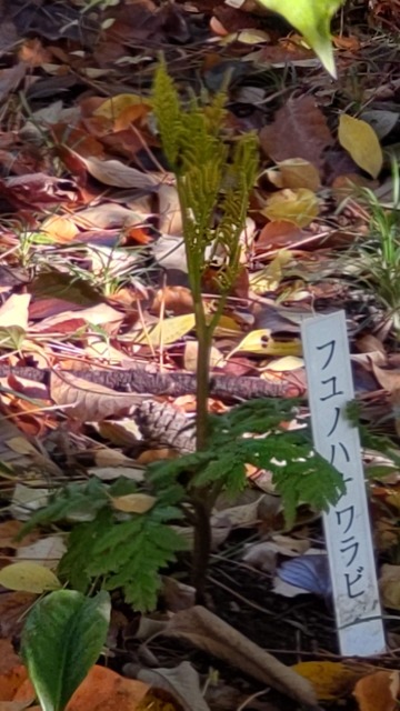フユノハナワラビは、シダ植物の一種である。 画像出典:牧野記念庭園にて筆者撮影 科名:ハナヤスリ科ハナワラビ属 学名: Botrychium ternatum 原産地:日本、中国、朝鮮半島、北アメリカ 生態:多年生シダ植物 別名:アキノハナワラビ 多年生のシダ植物で、わが国をはじめ中国や朝鮮半島、北アメリカに分布している。晩夏に葉を出し、小さな栄養葉を広げる。草丈は30㎝~40㎝程度になる。晩秋から冬に、小さな黄金色の胞子がついた、直立し二股に分かれた胞子葉を伸ばす。生育期間は秋から春までである。「ワラビ」と名にあるが、ワラビとは遠縁の植物である。しかし、「ワラビ」の名称が示すように、若い芽は湯がいて灰汁抜きしてから食用にすることができる。また、胞子葉の形状が独特なので、古くは観賞用にも栽培されたという。