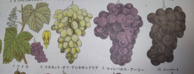 ブドウ(ヨーロッパブドウ)は果樹の一種である。 画像出典:筆者撮影 科名:ブドウ科ブドウ属 学名:Vitis vinifera 原産地:カスピ海沿岸 生態:落葉ツル性木本 中央アジアのカスピ海沿岸が原産で、わが国では近縁種のヤマブドウが食用にされ、鎌倉時代には栽培が始まっている。葉は両側に掌状に切れ込みのある15cmから20㎝ほどの大きさで、穂状の花をつける。果実は房状に実り、果実の色は黄緑色ないしは黒紫色、赤紫色、また紺色がある。果肉は薄緑色。果皮表面に噴き出た粉のようなものは「ブルーム」と呼ばれ、これはしばしば農薬と誤認されやすいが、果糖とよばれる糖分が染み出たもので、これが多いほど、果実が熟していることを示している。 果実は生食用ブドウと加工用ブドウに大別され、生食あるいはジュース、ジャム、レーズン、ワイン、ブランデーにする。房の上の部分ほど甘みが強くなり、房の下に行くに従い甘味も弱くなる。また、種子からは油を搾り、グレープシードオイルは食用油の中でも高級である。 画像出典:筆者の蔵書「原色図説植物大辞典」より抜粋。当時栽培されていたブドウの品種を図示したもの。