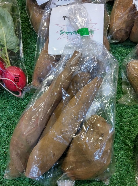 画像出典:(左)東京都薬用植物園にて筆者撮影/(右)自宅近くの農産物直売所にて筆者撮影 科名:キク科スマランサス属 学名:Smallanthus sonchifolius 原産地:南米 生態:多年草 ペルーやボリビアなどの南アメリカ地域が原産の多年草で、わが国には昭和時代末期(1985年)に渡来し、現在は流通量こそ多くはないが、健康野菜として栽培される。 草丈は1.8mほどになり、葉は大きな卵形で、葉柄には翼を持つ。茎の頂部に、小さなヒマワリのような黄色い花を咲かせる。地下に紡錘状の黄褐色の塊根を持ち、この塊根が食用にされる。 塊根はサツマイモに非常によく似ているが、サツマイモとは異なり、でんぷんではなくフラクトオリゴ糖を蓄積しているので、ナシやレンコンを思わせるようなシャリシャリとした食感とさわやかな甘みがあり、食用にされる。皮をむいて適当な大きさに切り、水にさらして灰汁抜きした後(収穫から1か月も保存すれば灰汁は次第に抜けてくる)に、食感を楽しむため生でサラダや和え物、酢の物にしたり、煮物やきんぴら、フライ、天ぷらなどの加熱調理もされる。加熱するとレンコンよりほくほくとした食感になる。サツマイモなどと比較してイモ類の中ではカロリー値が非常に低く、食物繊維も多分に含まれるのでダイエット食品として注目を浴びている。 葉も乾燥させてハーブティーとして用いる。