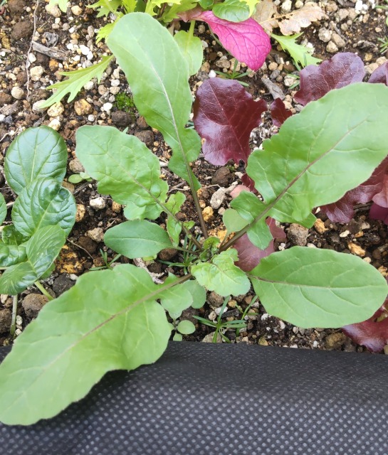 画像出典:大学の庭園で撮影 科名:アブラナ科キバナスズシロ属 学名:Eruca vesicaria subsp. sativa 原産地:地中海沿岸 生態:一年草 別名:ロケットサラダ 英名:Arugula,Rocket salad 地中海沿岸が原産の一年草で、わが国への正式な渡来時期はわかっていないものの、牧野富太郎のライバルにあたる村越三千男(1871~1948)の著書『内外植物原色大図鑑』(1935年)には「キバナスズシロ」という和名で収録されていることから、そのころにはすでに渡来し、栽培されていたようである。とはいえ、同書には食用としての利用の解説はなく、「庭園にて栽植し観賞用に供す」という記述のみがみられることから、現代でいうところのグラウンドカバー的に植えられていて、野菜としては顧みられていなかったものと思われる。 草丈は20㎝から100㎝で、葉は長い柄を持つ楕円形であるが、羽状に深裂したり、不規則な波状になったりと一定ではない。概して言えば、大根の葉を小さくしたような形状である。春に散房花序を出して、薄いクリーム色に紫色の縞模様が入る十字型の花を咲かせる。和名の「キバナ」という特徴にはやや当てはまらないように思われるが、これは野生品の花が鮮やかな黄色であったことに由来する。 葉は胡麻を思わせるような香りとピリッとした軽やかな辛味がある。子の風味は加熱すると弱まってしまうため、普通サラダやカルパッチョなど、なるべく生で食すことができるような調理法が向いている。また、おひたしや炒め物に使われるが、なるべく加熱しすぎないのがコツ。