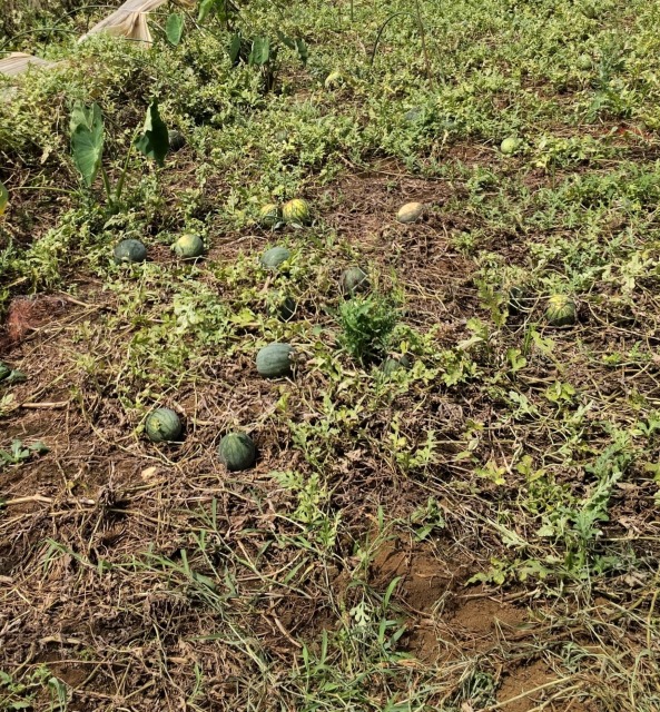 画像出典:(左)スイカの花と蔓。自宅近くの園芸店にて筆者撮影。(右)自宅近くの畑にて撮影。