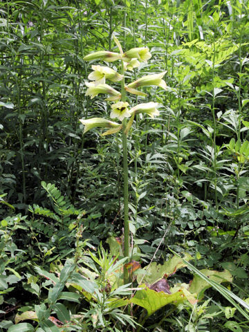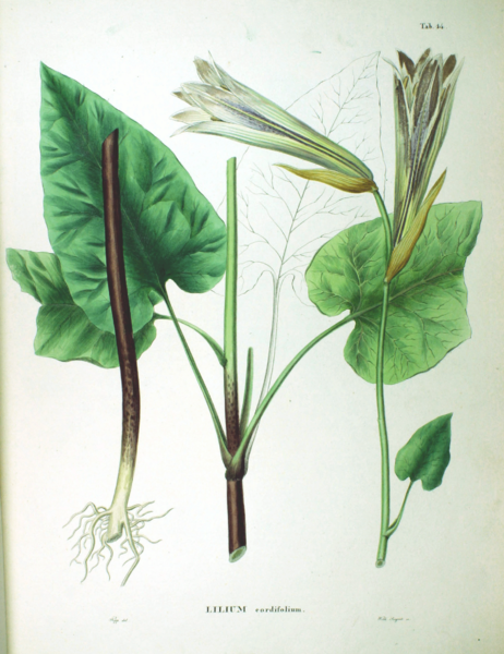 ウバユリとは、山野草の一種である。 画像出典: (上)https://commons.wikimedia.org/wiki/File:Cardiocrinum_sp_SZ14.png ウバユリの画像。シーボルト「日本植物誌」より抜粋 (下)オオウバユリの画像。https://botanic.jp/plants-aa/ooubay.htm 「ボタニックガーデン」より抜粋 科名:ユリ科ウバユリ属 学名:Cardiocrinum cordatum(Thunb.)makino var.cordatum 原産地:日本 生態:多年草 関東地方以西や四国、九州の山野の藪や林の中に生息する多年草である。草丈は50㎝~100㎝で、鱗茎は根生葉の柄の基部が重なり合ってできたものである。 花が咲く時にはこの鱗茎の栄養分がすっかり消費されるため古い鱗茎が消滅し、隣に新しい鱗茎ができている。この鱗茎からは良質なでんぷん(・・・・)が採取され、古くは凶作の際には重要な救荒用の野生植物とされていた。特にアイヌの人々は、食糧不足の折には絞り出したでんぷん(・・・・)を粥にして食べていたという。茎は平滑で、その茎の中ほどに5枚ないしは6枚の葉が付く。夏に押しつぶされたような独特な形状の黄緑色の花を咲かせ、花は側向かいに開く。古くはユリ属とされていたのだが、葉が単子葉類には珍しく網状脈を持ち、また花の独特の形状から、牧野富太郎が「ウバユリ属」を新設した。 近縁種のオオウバユリ(var.glehnii)は中部地方以北や北海道、南樺太やサハリンに生息し、特徴はウバユリに似ているが、株は全体的に大振りとなり、また花の数が多くなる。 和名は、花が咲く時に葉がなくなる様子を、歯の抜けた姥(うば)(おばあさん)にかけたしゃれ(・・・)である。