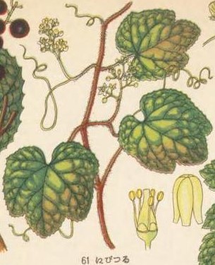 エビヅルとは、野生する樹木の一種である。 画像出典:村越三千男著『内外植物原色大図鑑』(国立国会図書館所蔵)より抜粋 科名:ブドウ科ブドウ属 学名:Vitis ficifolia 原産地:東アジア 生態:落葉ツル性木本 日本の本州や四国・九州に分布するほか、中国や朝鮮半島に分布する落葉のつる性樹木である。丘陵から山地の林縁などに生え、しばしば他物に絡みついて成長する。 葉は卵型寄りの三角形で、3~5つに裂け、互生する。初夏から夏にかけて葉と対生して円錐花序を出して花を咲かせ、花の色は黄緑色である。 秋に黒みの強い紫色の液果を房状につける。この果実は甘酸っぱいので食用になるほか、ジュースや果実酒を作ることができる。ただし、特有の松脂のようなにおいがあるため、近縁種のヤマブドウの方が好まれている。