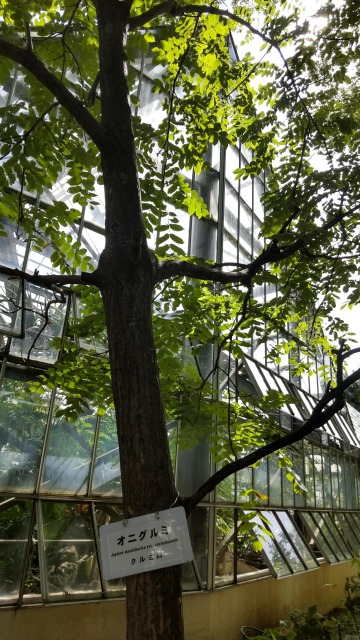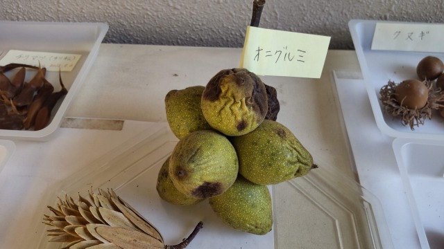 オニグルミとは、野生の果樹の一種である。 画像出典:いずれも東京都薬用植物園にて筆者撮影 科名:クルミ科クルミ属 学名:Juglans mandshurica var. sachalinensis 原産地:日本、ロシア 生態:落葉高木 我が国の各地や樺太、ロシアに分布する落葉高木で、縄文時代の遺跡から多く出土している頃から、わが国にはそのころから利用されていたのではないかと推測される。 湿り気の多い土地に生え、樹高は7m~10mに達する。葉は奇数羽状複葉で、小葉は5~9対つく。初夏に葉が開くと同時に赤い花を咲かせ、雌花序は同じ株の枝先に直立し、雄花序は同じ株の葉腋から下垂するようにして咲かせる。 9月から10月に殻に堅果をつけ、この堅果の内部は食用になる。堅果をペンチなどで割ってから食用になる子葉の部分を炒って食す。殻が分厚く、食用にすることができる部分が小さいので、現在はテウチグルミの方が多く利用される。また、木材は加工がしやすいので机や椅子、洋風家具、建築、フローリング、彫刻、小銃の銃床を作るのに用いられる。