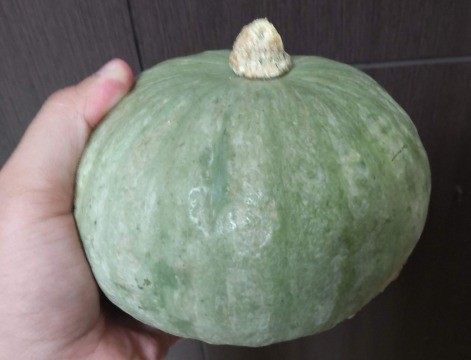 我が国では、青果用としてセイヨウカボチャ(クリカボチャ)、二ホンカボチャ、ペポカボチャが栽培され、市場に流通する。また、セイヨウカボチャとニホンカボチャの種間雑種や、クロダネカボチャがスイカやキュウリなどの苗の台木に用いられ、果実が市場流通することは、前者は「鉄かぶと」という品種*2がまれにあるものの、後者はほとんどない。また、北アメリカの先住民が栽培してきたミクスタカボチャという巨大な果実をつける品種群は、わが国での流通は全くと言っていいほどない。 セイヨウカボチャとニホンカボチャの種間雑種に、更にセイヨウカボチャを交配させた品種がある。それは「万次郎カボチャ」と呼ばれるものである。この品種はラグビーボール型の果実をつけ、果肉はニホンカボチャのしっとり感とセイヨウカボチャの甘さのいいとこどりのような風味である。しかも果実は長期保存が可能で、夏~秋に収穫すれば翌年の早春まで保存することが可能である。また、性質がかなり強健で病害虫に強く、耕作放棄地のような荒れた土地でもつるを茂らせ、また放任栽培でも大量の果実を実らせるという、かなりの優れものである。ただし、花粉が出にくいという特徴があるので、栽培する場合は花粉用としての別の品種の苗を植える必要がある(通販サイトで購入する際には、必ず授粉用のカボチャの苗がセットになっている)。 万次郎カボチャ。池袋の百貨店で筆者撮影。 この他に、種間雑種カボチャの一種に「プッチィーニ」がある。これは、セイヨウカボチャとペポカボチャの種間雑種で、果実はよくあるカボチャ型で、表面はクリーム色でオレンジ色の縦縞が入る。しっかりとした甘みがあるので、レンジで加熱しただけでも十分美味しく食べることができる。大きさを生かして、中身をくりぬいてから食材を詰め、グラタンにしても見た目もよく味もよい。また、見た目がかわいらしいのでハロウィンカボチャとしても用いることができ、花屋でもハロウィンのシーズンに入ると「ハロウィンカボチャ」名義で売られている。ただし、食用の品種でも花屋で売られている場合は、もともと花卉として栽培されているもので、野菜と花きでは使用できる農薬の基準値が異なるから、あまり食さないほうがよい。 プッチィーニ。自宅にて撮影。 セイヨウカボチャと二ホンカボチャ、ペポカボチャは見た目の変異が大きいので果実の形状からの区別は困難だが、果梗の形状や質感の違いから区別することができる。 セイヨウカボチャ→円柱形、コルク状。果実との接合部は広がらない。細かいとげがある。 二ホンカボチャ→五角形ないしは六角形、木質化。果実との接合部が広がり「座」を作る。 ペポカボチャ→五角形ないしは六角形、木質化果実との接合部は広がらない。品種によっては細かいとげがある。