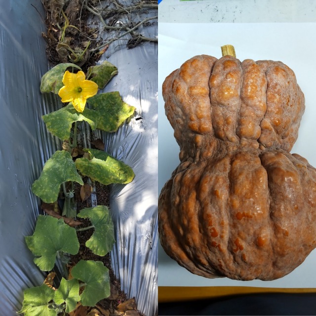(左)バターナッツ。煮物には向かないが、グリルやポタージュに向く。見た目が面白いので、観賞用にされることもある。自宅にて筆者撮影。果実はそれほど大きくないので家庭菜園に向く。(右)小菊。自宅にて筆者撮影。菊座型で、果実が小さいのが特徴。煮物にしてもよいが、中身をくりぬいて食材を詰め、蒸してもよい。