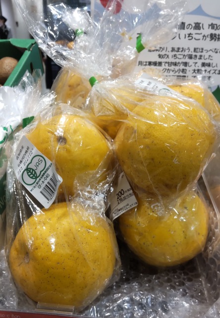 画像出典:左右いずれも東京都豊島区池袋の百貨店にて撮影 科名:ミカン科ミカン属 学名:Citrus kawachiensis 原産地:熊本県 生態:常緑低木 昭和前期に熊本県飽託郡河内村(現・熊本市西区河内町)で発見された品種で、かつてはザボンの枝変わり種であるといわれていたが、現在はゲノム解析の結果から台湾産のザボンの変種であるユゲヒョウカンの変種であるとする説が有力である。 名称は、河内村に産することと、ほかの柑橘類より晩生で、しかもほかの柑橘類の生産が滞りがちになる春~初夏によく収穫されることから。出回り期間も3月から8月と、わが国で生産される柑橘類の中では最長である。春以降も樹に果実を残して熟させると、その隣で新しく花が咲き、果実が付き始める。このころに農薬などを使用すると、成長前の果実も農薬を吸収してしまい、安全性が危惧され、商品価値も低下する。よって、晩春から梅雨時期以後はほとんど農薬を使うことができないので、前年度に実らせた果実や新しい果実の表面に細かなかさぶた状のものができて乾燥したような見た目になるなど、決して見た目がいいといえないものが出回りがちとなる。 風味と食感がグレープフルーツに似ているため、しばしば「和製グレープフルーツ」の名称を関して販売される。現在は「美生柑」*1、「宇和ゴールド」「ジューシーオレンジ」など数多くのブランド名がある。