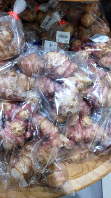 画像出典:(左)東京都薬用植物園にて筆者撮影/(右)所沢市の商業施設にて撮影 科名:キク科ヒマワリ属 学名:Helianthus tuberosus L. 原産地:北米 生態:多年草 北米が原産の多年草で、わが国には江戸時代末期に飼料用作物として渡来したといわれるのだが、来歴には諸説がある。たとえば農学者の津田仙(女子教育者・津田梅子の父親)は、「1861年に渡来した」と明治9年に記録している他、「イギリス全権公使・オールコックが逗留先の高輪東禅寺の庭で手持ち無沙汰を解消するために非常食として持参していた芋を植えて育て、収穫した芋を自ら調理してときの老中・安藤対馬守信正にふるまった」とも記録している。また1863年に、横浜に入港したアメリカ船の船員がキクイモを棄てたものが発芽し、これが日本における栽培の始まりとする説も存在する。北海道では飼料用の作物として大規模な栽培がおこなわれ、特に戦中戦後には非常食としても多く栽培された。現在は各地に雑草として帰化しており、特に北海道での野生品の発見例が多いのはこうした事情によるものである。家庭菜園でも栽培されるほか、農産物直売所でも見かけるようになっている。 地下にある巨大な塊茎から春に芽を出し、草丈1mから3mほどの大きさにまで成長する。茎は直立し、しばしば枝分かれする。茎と葉には硬い毛が密に生えてざらざらしている。葉は先のとがった卵状の長楕円形で、長さ20~30cmと細長くなり、茎の下部の葉は対生し、茎の上部の葉は互生する。秋になると、小さなヒマワリのような黄色い頭状花が上部の枝先にひとつずつ咲く。この花は短日花で、朝に開き、夕方にはしぼむ。 秋に地上部が黄色くなって枯れ始めたころに塊茎を掘り出して食用にする。塊茎の色合いは白褐色と紫色の2種がある。塊茎にはデンプンは含まれないが、イヌリンが含まれるため、果糖やアルコールの原料にされるほか、ジャガイモとゴボウに似た風味とシャリシャリとした食感を持ち、煮物や漬物などにする。また、春に芽生えた若い苗も青菜として食用にすることができる。 英名はJerusalem artichokeというが、イスラエルの都市のエルサレムとは一切関係がない。これはおそらく古いイタリア語で Girasole Articiocco(ヒマワリのようなアーティチョーク)と呼んでいたものが崩れて「エルサレム」と発音されるようになったためであるという。