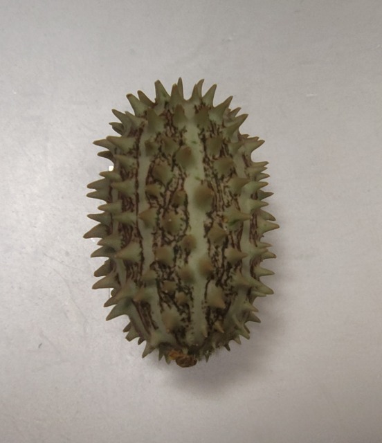 画像出典:自宅にて筆者撮影 アフリカが原産のウリ科キュウリ属の一年草で、楕円形の果実をつける。 果実表面は薄い黄緑色地に灰色の縦じま模様が入り、太い棘で覆われているが、この棘は触ってもそれほど痛くない。 原産地では小さい果実を実らせる個体のものは苦くて食用にはされず、大きくて円筒形の果実をつける個体のものはピクルスにして食用とするという。