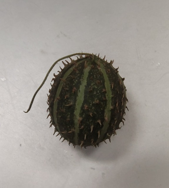 画像出典:自宅にて筆者撮影 上記と同じくウリ科キュウリ属の蔓性一年草で、熱帯アフリカが原産である。乾燥地帯が原産ということによるものか、葉はスイカを思わせるような見た目で、細く切れ込む掌状葉となっている。 果実の形状もスイカに似ているが、表面には短くやや硬い棘がまばらに生える。こちらも観賞用として栽培され、果実には猛烈な苦みがあるので食用にはされない。