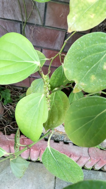 画像出典:左右いずれも東京都薬用植物園にて筆者撮影 科名;コショウ科コショウ属 学名:Piper nigrum 原産地:インド 生態:常緑蔓性木本 インド南西部のマラバル沿岸が原産で、東南アジアや南米でも栽培されるつる性の常緑木本植物である。わが国には奈良時代に中国から薬用植物として輸入され、平安時代には調味料としての利用が始まっている。 茎は蔓性で、長さは5m~9mに達し、しばしば他のものに絡みつく。 葉は卵形で互生する。穂状花序をだして淡黄白色の花を咲かせ、果実は液果で緑色から赤色に熟す。未熟果を乾燥させたものがブラックペッパー、未熟果を塩蔵したものがグリーンペッパー、完熟してから乾燥させたのちに水に漬けて外皮を柔らかくして剥がしたものがホワイトペッパー、完熟果を乾燥させたのち、その果皮をはがさないものがレッドペッパーである。 果実には柑橘類を思わせるような強い芳香と強烈な辛みがあり、香辛料の中でも多く用いられる。香辛料としては乾燥品が多く用いられるが、タイでは生のコショウが薬味として用いられる。