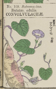 サツマイモは、食用にする植物の一つである。よく肥え太った根を食用にする。 画像出典:有用植物図説
