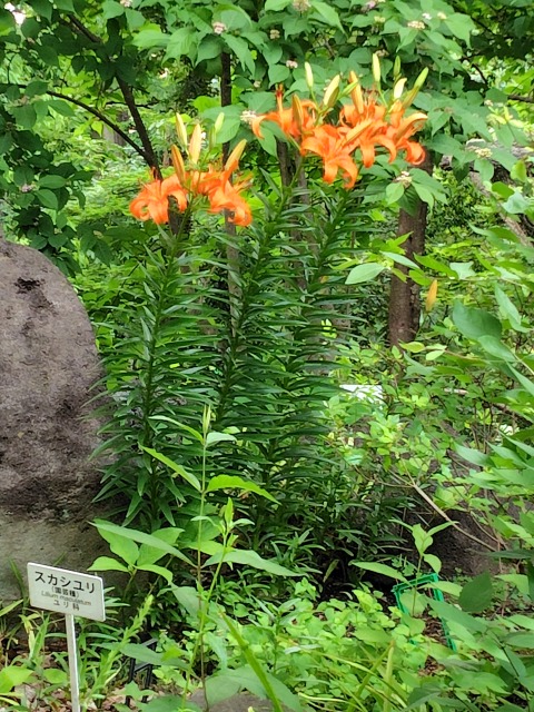 スカシユリ(透かし百合)とは、花きの一種である。 画像出典:東京都薬用植物園にて筆者撮影 科名:ユリ科ユリ属 学名:Lillium maculatum Thunb.var.maculatum 原産地:日本 生態:多年草 中部地方以北の海岸の砂浜や産地の崖側の場所に生息するほか、花を観賞用にするため園芸植物として栽培される多年生草本である。 野生品の草丈は生育環境により異なってくるが20㎝から60㎝程となり、庭に植えて栽培する場合は100㎝程度となる。茎は鮮やかな緑色で稜角があり、角ばっている。 葉は幅広い線形で全長は5㎝から10㎝となり、先端は尖り、厚みと光沢がある。 初夏から夏の盛りにかけて茎の頂点に1つから3つの花を上向きに咲かせる。花被片は鮮やかなオレンジ色で先端は反り返り、赤い細かな斑点が入るのが特徴である。一重咲きのものや八重咲のものがある。 草姿は本種とほぼ同一であるが、東北地方~北海道の海岸、カムチャツカ、東アジアの冷温帯地域に生息する個体は「エゾスカシユリ」という別個体であるとされている。スカシユリと比較して、花柄やつぼみに綿毛が多いのが特徴である。