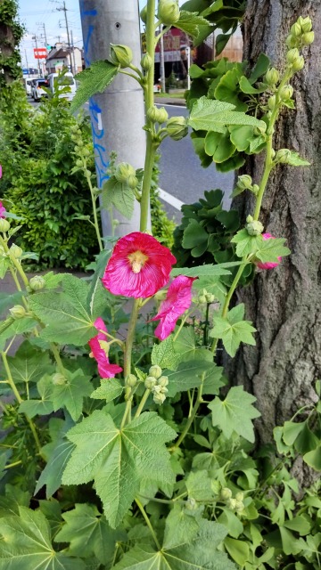 タチアオイとは、園芸植物の一種である。英名の「ホリホック」でも知られる。 画像出典:自宅近くの植込みを撮影 科名:アオイ科タチアオイ属 学名:Althea rosea 原産地:トルコ~小アジア 生態:多年草 トルコや小アジアが原産の多年草で、わが国には室町時代に渡来し、現在に至るまで数多くの園芸品種が作出され、栽培されている。 茎は直立し、草丈は2m~3mに達する。この性質が和名の由来となっている。葉は掌状で、浅く5裂する。5月から9月にかけて茎の下から穂状に花を咲かせる。花の寿命はそれほど長くはないが、徐々に花茎が出てくるため、1つの株に花が咲く期間が長くなる。 花は同じアオイ科のフヨウに似ているが一回り小さく、赤色や薄いピンク色、白色や黒紫色など多彩で、咲き方も一重咲きや八重咲などの複数の種類がある。 普通は庭に栽培されるが、こぼれ種で殖えるほど繁殖力が強く、野生化することもある。画像は、野生化していたものを撮影。
