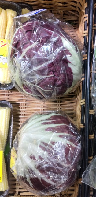 画像出典:(上)池袋の百貨店にて筆者撮影。(中1)「プレコーチェ」。東京都国分寺市にて筆者撮影。(中2)「タルディーボ」の画像。https://ja.wikipedia.org/wiki/%E3%83%81%E3%82%B3%E3%83%AA%E3%83%BC 著作者:Zetagroup(CC BY-SA 3.0) (下)「カステルフランコ」。新宿の百貨店にて撮影 植物学上はチコリと同一な品種の野菜である。わが国には1980年代に導入されていて、いまだ新顔野菜としての性格が強いといえる。紫キャベツに似た形状のもの(「キオッジャ」。このタイプがわが国でしばしば「トレビス」の和名で呼ばれるものである)と、写真のように白菜に似た形状(「プレコーチェ」。「ラディッキオ」の名称で呼ばれるタイプは多くがこれ)のもの、細長い葉を持ち、葉が結球しないもの(「タルディーヴォ」)、薄黄色地に赤い斑点が入るバラの花の形状をおもわせるもの(「カステルフランコ」)がある。 一般的には色あいを生かしてサラダにするが、パスタの具材やグリルして肉料理・魚料理の付け合わせにする。根もコーヒーの代用として利用できる。