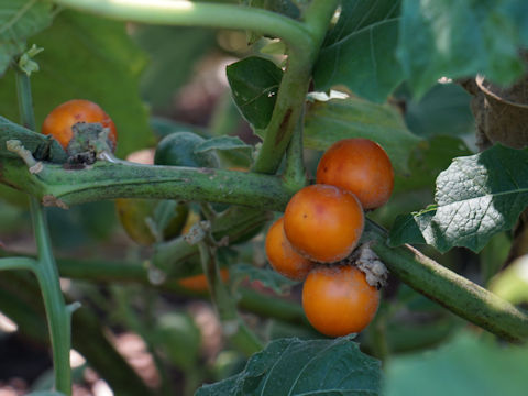 画像出典:https://www.botanic.jp/plants-na/naranj.htm 『ボタニックガーデン』の「ナランジラ」のページより引用。 科名:ナス科ナス属 学名:Solanum quitoense 原産地:南米 生態:多年草草本 別名:ルロ(Lulo) 草丈は2mほどに達する多年草草本で、茎は直立し、多少枝分かれして茎の下部は木質化する。果実は直径8㎝程度の球形で、当初は表面に桃のような産毛があるが、成長するにつれて抜け落ち、果実色も緑色から黄色味の強い橙色に変色する。 果実は柿に似た見た目であるが、ナス科植物には珍しくかんきつ系の香りを持っており、味は柿とオレンジを足したような風味であると言われる。原産地の南米では生食するほか肉料理のソースにしたり、ピューレにしたものに砂糖やはちみつを加えてアイスクリームやジュースにしたりと、人気の食材である。 ニュージーランドでは商業的な栽培がおこなわれており、わが国にもごくまれにニュージーランド産のものが入ってくることがある。