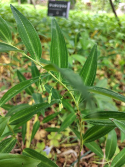 ナルコユリとは、山野草の一種である。 画像出典:牧野記念庭園にて筆者撮影。 科名:キジカクシ科ナルコユリ属 学名:Polygonatum falcatum A.Gray 原産地:日本 生態:多年草 山地の林にまゝ見られる多年草で、地下茎は横に這うようにして地下に張り巡らされ、そこから早春に芽を出し、草丈は50cmから100cmに成長する。 葉はやゝ幅の広い披針形で、長さは10cmから15cm程度である。同属のアマドコロとは茎が角張らない点で区別する。5月から6月に、葉腋から花柄を出してやゝ黄緑がかった筒状の白い花を下に垂れ下がるようにして咲かせる。秋には黒っぽい青緑色の直径1cmほどの果実をつける。 若い葉や根茎は古くから食用に親しまれてきたが、数を減らしつゝあるため、むやみな採取は控える。