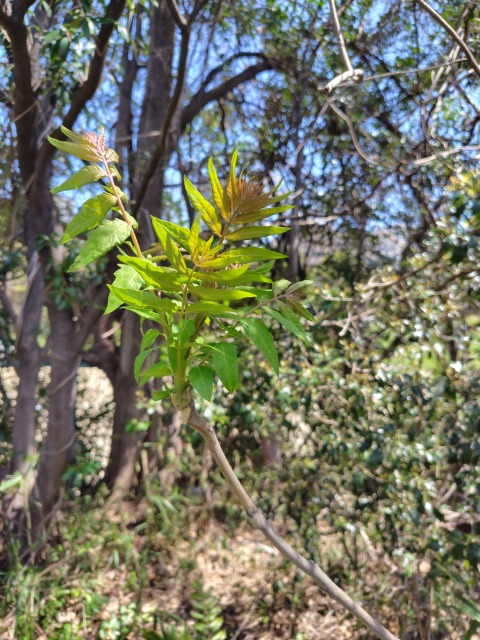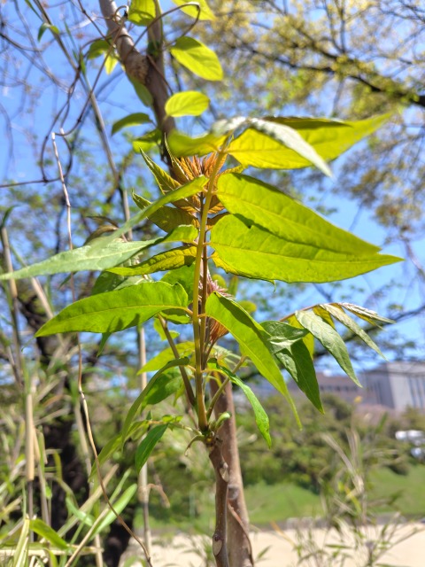 ニワウルシ(庭漆、神樹)とは、樹木の一種である。 画像出典:東京都千代田区四谷にて筆者撮影 科名:ニガキ科シンジュ属 学名:Ailanthus altissima Swingle 原産地:中国 生態:落葉高木 中国が原産の落葉高木で、我が国には明治時代に渡来し、各地に公園樹として植えられるほか、生育力が旺盛のため、各地で野生化している例もみられる。 樹皮は灰色がかった褐色で、表面は平滑である。葉は奇数羽状複葉で枝に互生し、複葉全体の長さは40㎝から80㎝となる。この複葉を構成する小葉は基部に2つの大きな鋸歯があり、13枚から25枚となる。雌雄異株で、7月から8月にかけて枝先に円錐花序をだし、緑がかった白い小さな花を咲かせる。果実はいわゆる翼果で、種子は風によって散布される。 「シンジュ」という別名でも知られており、漢字では「神樹」と表記する。これは英語名のTree of heavenを直訳したものである。名前に「ウルシ」とあるが、本種は植物学上はウルシとは別科の種であり、また樹皮や葉に触ってもウルシのようにかぶれることはない。それゆえ、公園樹として栽植されるのである。材を器具に加工するほか、樹皮は殺虫剤に加工される。中国では根皮や樹皮を「樗白皮(チョハクヒ)」の名で、生薬として解熱・止瀉・止血・駆虫などに用いる。 樹形はチャンチンに似るが、若い芽が黄色または薄い黄緑色になる点で区別する。