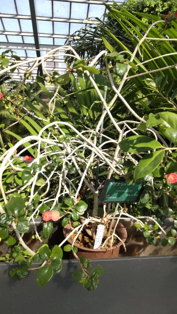 ハナキリンとは、観賞用の植物の一種である。 画像出典:いずれも板橋区立熱帯植物環境館にて撮影 科名:トウダイグサ科トウダイグサ属 学名:Euphorbia milii var. splendens 原産地:マダガスカル 生態:常緑低木 マダガスカル島が原産の常緑低木で、わが国には大正時代に渡来し、昭和初期に大ヒットして以来、現在は観賞用として植物園の温室や庭園に植えられている。 茎は多肉質でトゲが密集し、当初は直立するが、成長するにつれて半蔓性となり、ほかのものに絡みついて成長する。長さ3cmほどの葉は楕円形で、茎の先端につき、これが成長するとトゲ状になる。園芸品種の中には、品種改良によるものか、あるいは突然変異によるものかトゲが消滅したものがある。 茎の先端に直径1㎝~2㎝程の花を観賞し、花色は赤色やピンク色、白色などがあり多彩。ここで「花」と解説した部分は正確には「苞」と呼ばれる部分であり、本来の花は苞に包まれており、黄色で小さく、目立たない。この色づいた花弁にも見える「苞」を観賞用とする。 茎を折ると出てくる樹液は有毒で、皮膚炎などの症状を引き起こすことがあり、また幹には鋭いとげがあるので、手入れの際には必ずゴム手袋をするべきである。