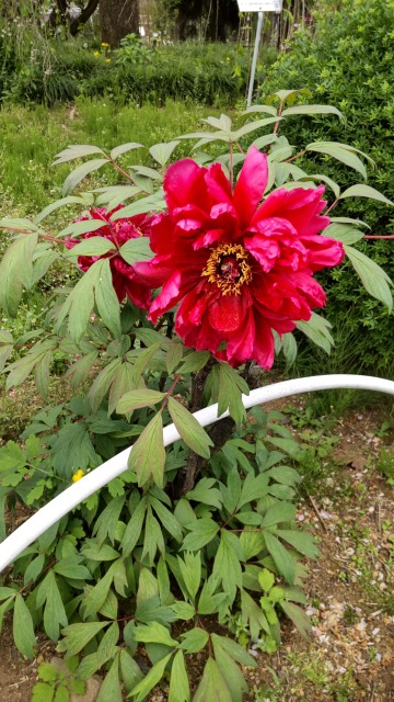 画像出典:東京都薬用植物園にて筆者撮影 科名:ボタン科ボタン属 学名:Paeonia suffruticosa 原産地:中国北西部 生態:落葉低木 中国北西部が原産の落葉低木で、わが国には天平時代に渡来したとも、平安時代初期に唐から日本に帰ってきた空海が持ち込んだとも伝わっている。江戸時代には園芸品種として親しまれており、花卉や果樹などの園芸植物の管理方法を扱ったテキスト「花壇地錦抄」にも記載されている。多くの園芸品種があり、樹高が50cmから180cmと幅が広い。樹皮は黒褐色で、表面はごつごつしている。 普通4月から5月にかけて花を咲かせるが、早春に花を咲かせる「寒牡丹」という品種もある。花の咲き方は一重咲きや八重咲があり、花の色も濃い赤色やマゼンタピンク、白に近いピンク色や純白などと多彩である。 漢方では根の皮を「牡丹皮(ボタンピ)」と呼び、鎮痛、消炎、浄血に利用する。 漢名の「牡丹」は、明代に刊行された生物百科事典「本草項目」によれば「牡丹ハ色丹(あか)*1ナルヲ以テ上ト為ス 子ヲ結ブト雖(いえど)モ根上ニ苗ヲ生ズ 故ニ是ヲ牡(おす)ト云フ」とある。 この文が描かれた当時から、牡丹は赤色の品種が最上品であるとされていた。しかし、その木から種子を取って育てた子どもの木は必ずしも同じ花を咲かせるわけではないので、翌年も確実に赤い花を見たい場合は株分けによって増やさなければならない。 それを子ができぬオスになぞらえて、「牡丹」という字を当てたのである。 1929年にウメに変更されるまでは、ボタンは中国の国花であった。なお、よく似た植物にシャクヤクがあり、両者は見た目では区別しにくい。本種は樹木で冬でも地上部が残るが、シャクヤクは多年草であるため、冬には地上部が枯れてしまうという点で区別する。 現在、園芸植物として人気のあるボタンであるが、栽培には少しコツが要る。まず、苗木を植える時期は10月でなければならない。というのも、園芸用の樹木の中では根が動き出すのが早く、たいていの庭木の植え付けに最適な落葉する時期を待っていると、根が徒長して鉢から出てしまい、根が傷んで弱ってしまうためである。 園芸店で売られているボタンの根巻きの苗は、通常シャクヤクの台木に接ぎ木してある苗である。シャクヤクは草本植物であるのだが、不完全ながらも形成層を持っているという。とはいえ、植え付けから2年以上たつとシャクヤクの台木としての効果が弱まってくるため、接目より上に土を盛り、更に接目を針金でしばるとボタン自身の根が早く出てくる。