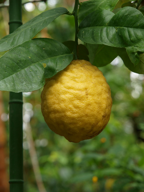 マルブシュカンとは、果樹の一種である。現在は「シトロン」の名称で知られる。 画像出典:http://jusa.sakura.ne.jp/zukan/sitoron.html 科名:ミカン科ミカン属 学名:Citrus medica 原産地:インド 生態:常緑低木 インドが原産の常緑低木で、わが国には遅くとも鎌倉時代に渡来している。樹高は3mほどで、樹の全体的な特徴はブッシュカンに同じで、樹高は3m~5mに達し、葉腋には棘があり、葉は先のとがる卵型である。 初夏に、薄紫色がかった白い花を咲かせ、秋から冬にかけて果実を実らせる。 果実はレモンに似ているが、レモンより一回り大きく、果皮がより厚くなっており、表面はややデコボコしている。果肉は果皮から離れにくい。 果実を砂糖漬けにして食用にするほか、果皮を菓子の風味づけにする。