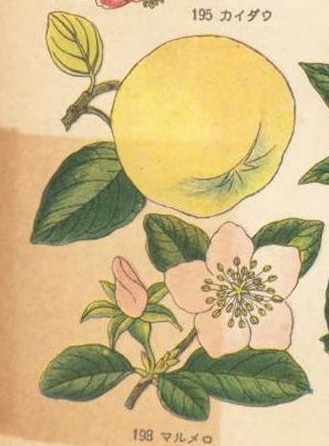 マルメロは、果樹の一種である。 画像出典:村越三千男著『内外植物原色大図鑑』(国立国会図書館所蔵)より抜粋 科名:バラ科マルメロ属 学名:Cydonia oblonga 原産地:中近東 生態:落葉高木 ペルシャやトルキスタンなどの中近東が原産の落葉高木で、わが国には江戸時代初期(1634年)に渡来し、今では世界中で栽培される。樹高は8mで、葉は互生し、卵型で長さは5㎝~10㎝で、表面に短い毛がある。晩春に花を咲かせ、枝先に白色や薄紅色の花を咲かせる。夏から秋にややごつごつした球形或いは洋ナシ形の果実をつけ、10月以降黄色く熟してくる。果実はモモのように短い毛におおわれ、一見おいしそうに見えるが酸味が強く、果肉は繊維質で石細胞が大量に含まれ、じゃりじゃりとした食感であるから生食には向かず、薄く切ってジャムや砂糖漬けにして食す。調理する前に、果実を水でよく洗って毛を落とすことが大切である。 カリンと似た見た目をしているため、しばしば「西洋かりん」と呼称されるが、植物学上カリンとは別種である。カリンとは果実が無毛で寸胴、枕型であることで区別できる。 和名はポルトガル語に基づく。