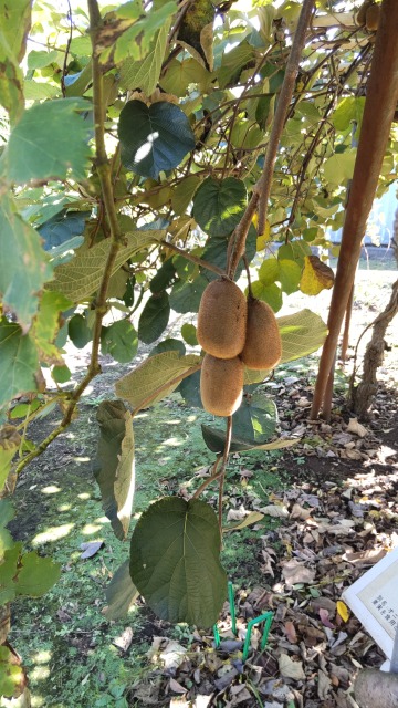 キウイフルーツは、果樹の一種である。 ||| 画像出典:いずれも東京都薬用植物園にて筆者撮影 科名:サルナシ科マタタビ属 学名:Actinidia chinensis 原産地:中国 生態:落葉ツル性大木 別名:シナサルナシ、オニマタタビ 中国大陸原産のつる性の落葉の大木である。雌雄異株で、幹や枝は褐色で、葉は長さ10㎝~15㎝の楕円形である。葉腋に直径3㎝の白い花をつけ、チャノキとよく似た見た目をしており、芳香がある。 花は雌雄の別があり、雄花に多数のおしべがある。果実は長さ5㎝~8㎝の楕円形で、表面には黄色味の茶色の短い毛がある。夏に果実をつけ、秋から冬にかけて熟する。酸味が強いので、2~3週間の追熟期間が必要である。 我が国には昭和三十年代に紹介され、四十年代になって一気に栽培が広まり、今では家庭果樹として人気の樹種となっている。 果肉色はふつう黄緑色だが、ゴールドキウイという品種もある。そちらは果肉が黄色で、果実の表面はあまり毛がなく、先端がレモンのようにとがるのが特徴。果汁には肉を柔らかくする効果があり、この効果はパイナップルも持っている。 日本語の文献では漢字表記として「猕猴桃」と表記されるが、これは現在はサルナシの漢名として用いられることが多く、「中華猕猴桃」の方がよく用いられている。