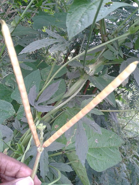 画像出典:https://commons.wikimedia.org/wiki/File:2._%E0%AE%95%E0%AE%BE%E0%AE%B0%E0%AE%BE%E0%AE%AE%E0%AE%A3%E0%AE%BF-Vigna_unguiculata.jpg?uselang=ja 草丈は30㎝~40㎝で、蔓性にはならない一年草である。上記の品種群で言えば、ハの品種群に属する。莢がⅤの字状に実るのが特徴で、種実は小さい。種実が黒褐色のものをハタササゲと呼び、種実が黄色に近い色合いのものをヤッコササゲと呼ぶ。江戸時代に九州南部で種実を赤飯に用いていたという記録が残っている。現在はわが国では野生化していることが多い。アメリカでは飼料作物として栽培されている。 江戸時代に刊行された『本草図譜』や明治中期に刊行された『有用植物図説』には、このハタササゲの莢がくるりと丸まったような「メガネササゲ」と呼ばれるものが栽培されていたという記載が彩色図版とともにある。現在、「メガネササゲ」が野生化していることはおろか、栽培されているという話は寡聞にして知らない。