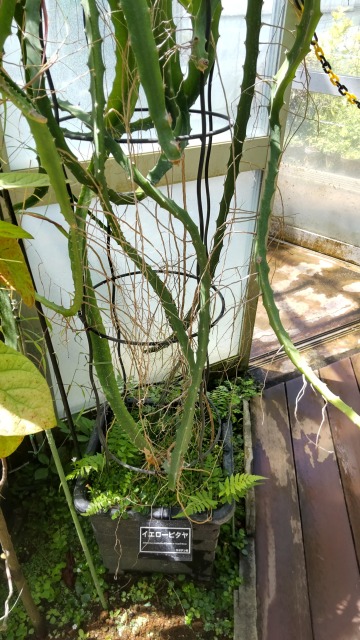 サンカクサボテンは、園芸植物の一種である。 画像出典:大船フラワーセンターにて撮影 科名:サボテン科ヒロセレウス属 学名:Hylocereus undatus 原産地:中央アメリカ 生態:常緑多年草 メキシコなどの中央アメリカが原産で、わが国には明治時代に日本に導入され、「三角柱」の名称で栽培されてきた。茎は三角柱状で、茎節からは気根がでて、岸壁や樹木に付着して蔓のようによじ登り、この茎の長さは10mにも及ぶ。 気温の高い地域では周年芳香のある直径30㎝内外の白い花を咲かせ(この花は近縁種の月下美人?と非常によく似ている)、花の後にはウロコのようなものがある鮮やかなマゼンタ色の果実をつける。この果実は果物として食用にすることができ、「ドラゴンフルーツ」や「ピタヤ」の名称で流通する。 果肉は白色や赤色で、無数のゴマ粒のような種子があり、果肉ごと食することができる。また、果皮が黄色く果肉が白い品種は植物学上ではヒロセレウス属ではなく、セレニケレウス属という別種であるが、「ドラゴンフルーツ」として市場に少数ながらも流通する。 植物学上は、果肉や果皮の色ごとに以下のように分けることができる。 白肉種(ピタヤ)→Hylocereus undatus 赤肉種(レッドピタヤ)→Hylocereus costaricensisとHylocereus polyrhizusの2種 黄皮白肉種(イエローピタヤ)→Selenicereus megalanthus