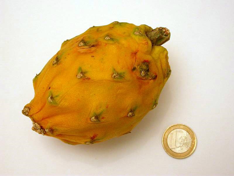 画像出典:(左)Selenicereus megalanthusの株。東京薬科大学薬用植物園温室にて筆者撮影。(右)https://commons.wikimedia.org/wiki/File:Selenicereus_megalanthus.JPG 著作者: Abrahami(Public Domain) Selenicereus megalanthusの果実。ヒロセレウス属の果実より味は劣ると評されるものの、果樹として栽培される。 果物としての利用以外にも、性質が強靭であるため、ほかのサボテン類の苗の接ぎ木用の台木として用いられる(もともとは台木用にもたらされた品種であった。果実が食用として知られるようになったのは偶然の産物の結果である。)。