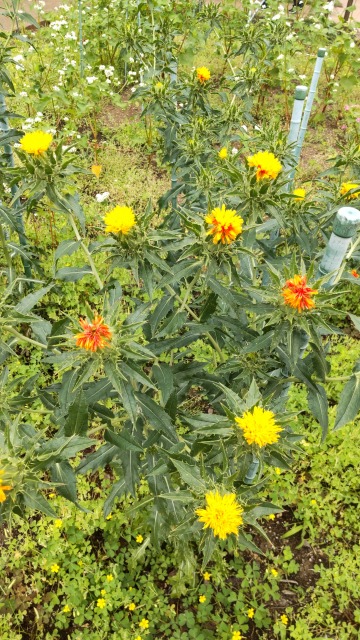 ベニバナとは、染料植物の一種である。 画像出典:いずれも東京都薬用植物園にて筆者撮影