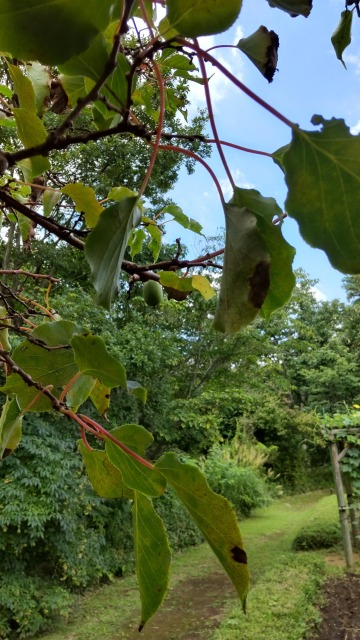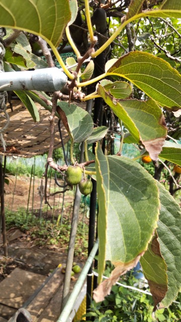 画像出典:(左)神代植物公園にて撮影/(右)自宅近くの畑にて撮影。廃材を組み合わせて棚を作り、そこにサルナシの蔓やニホンカボチャ(バターナッツ)、オモチャカボチャ(後ろに見えるオレンジ色の果実)の蔓を這わせていた。 科名:マタタビ科マタタビ属 学名:Actinidia arguta 原産地:東アジア 生態:落葉蔓性低木 別名:シラクチヅル、コクワ 東アジアが原産のつる性落葉低木で、わが国の山林内に生える。雌雄異株で、幹の直径は15㎝ほどである。葉は互生し、葉の長さは6㎝~10㎝で、粗い毛があり、とげ状の鋸歯が縁にある。夏に花を咲かせ、雄花は集散花序、雌花は単生する。いずれも白い5枚の花弁を5枚の蕚片を持つ。後述するように果実もそうだが、本種の花は同属のキウイフルーツとよく似ている。 果実は臼型ないしは上下を押しつぶしたような球形でやゝくすんだ黄緑色をしており、直径は3㎝ほど、表面には毛がなく、日が当たる部分はやや赤色が差す。果実の横断面はキウイフルーツと非常によく似ている。果実は甘酸っぱい風味があるので生食することができ、果実酒にもする。アメリカでは日本から輸入した苗木が「ベビーキウイ」の名称で栽培され、果実が日本に逆輸入される形で市場に流通する。 また、蔓は強靭なので、編み込んでかずら橋の材料にする。